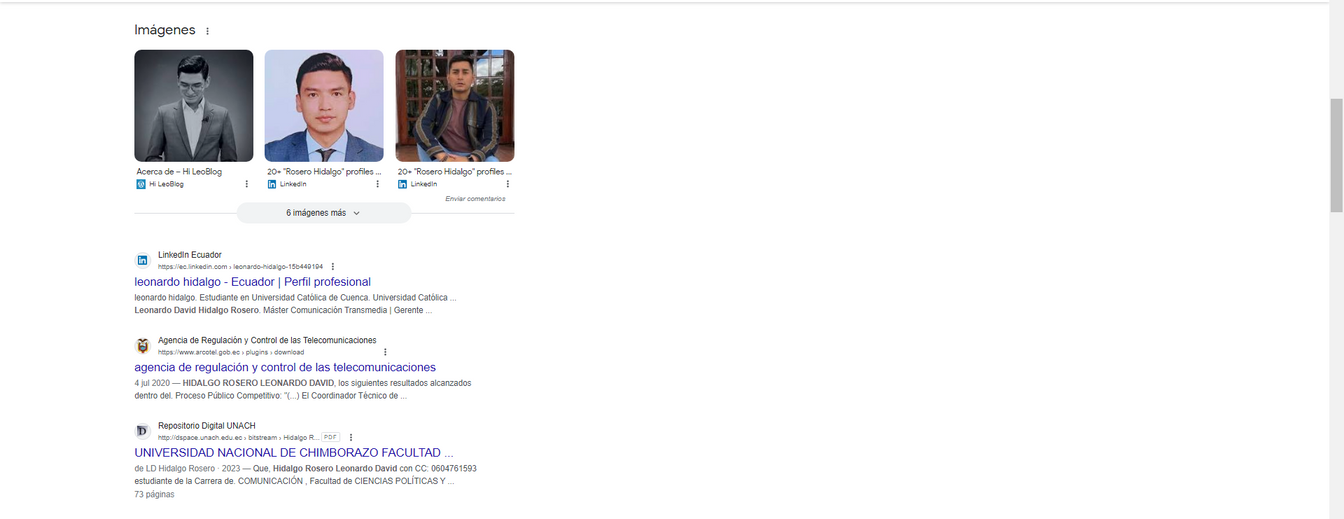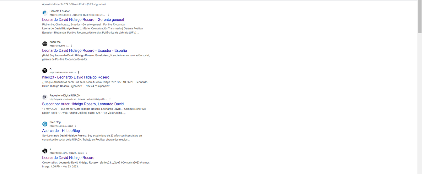 Es relevante ver los perfiles en LinkedIn y About.me en los primeros lugares.